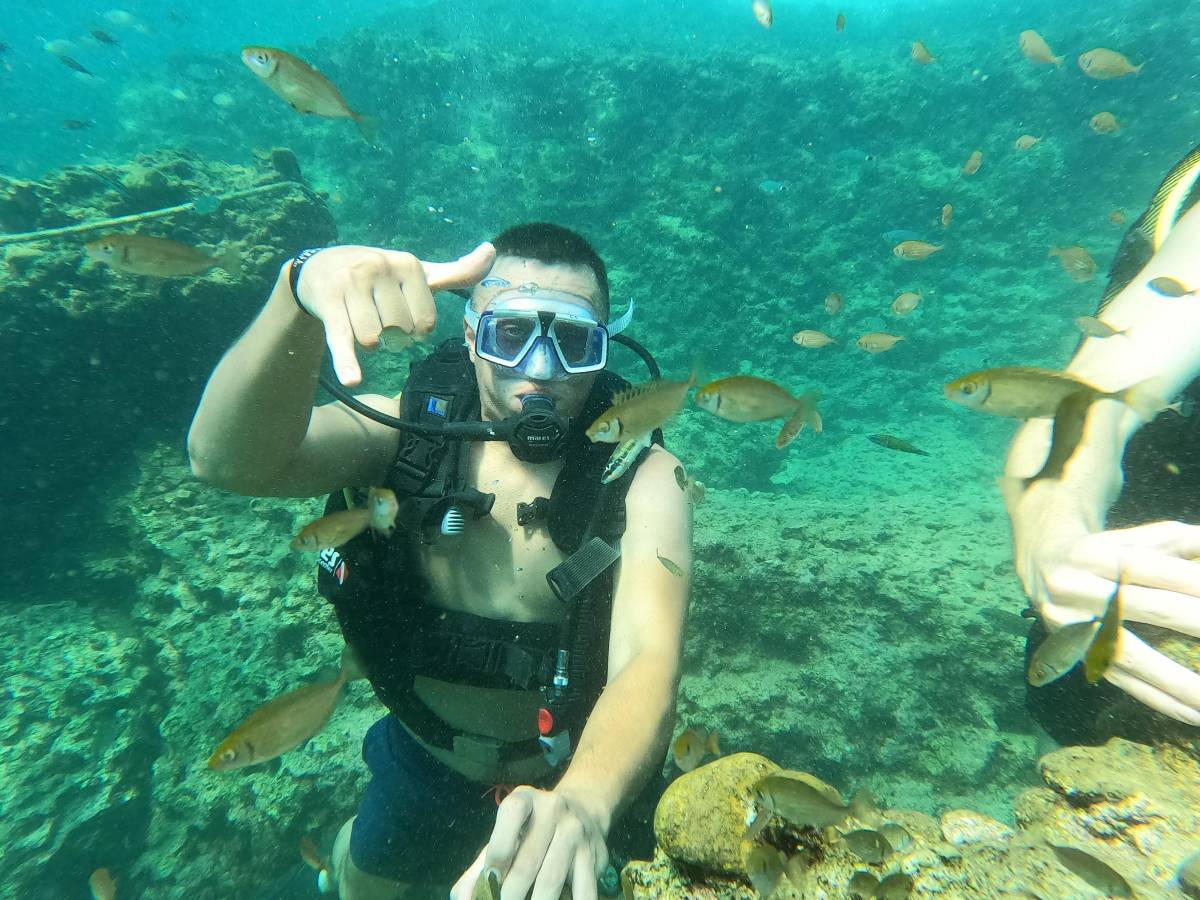 A deeper dive (10–12 meters) depending on experience. Discover caves, corals, and small wrecks.